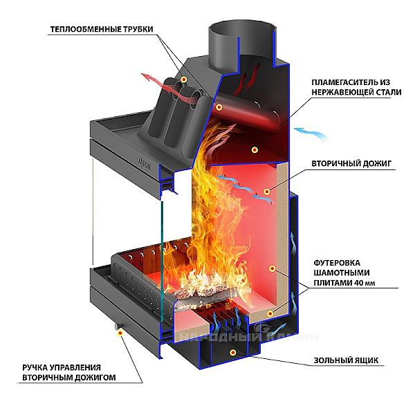 Топка оборудована системой вторичного дожига дымовых газов, которая позволяет получить максимум энергии при горении дров. Каналы вторичного дожига расположены на задней стенке топочной камеры прямо в шамотной облицовке.