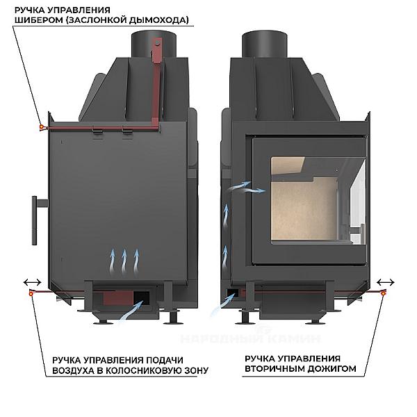 Регулирование тяги возможно с использованием шибера, встроенного в патрубок дымохода диаметром 200 мм. Ручка управления шибером размещается на передней поверхности топки, справа вверху.