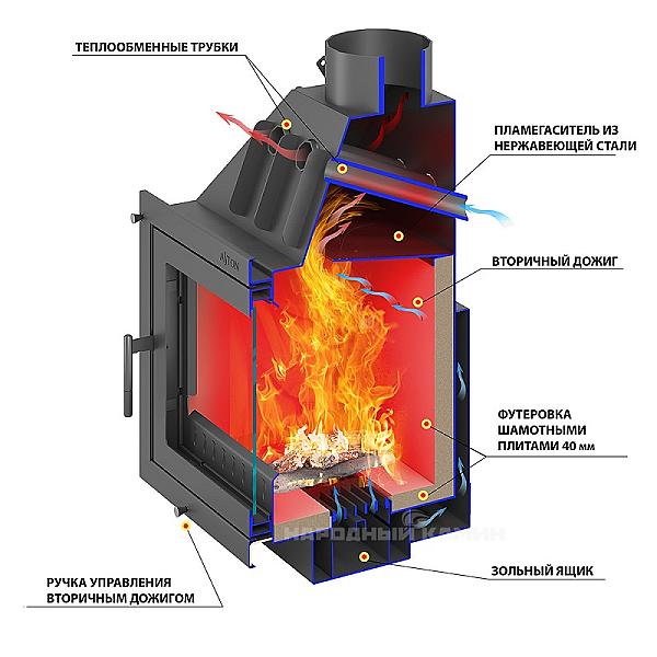 Топка оборудована системой вторичного дожига дымовых газов, которая позволяет получить максимум энергии при горении дров. Каналы вторичного дожига расположены на задней стенке топочной камеры прямо в вермикулитовой облицовке.