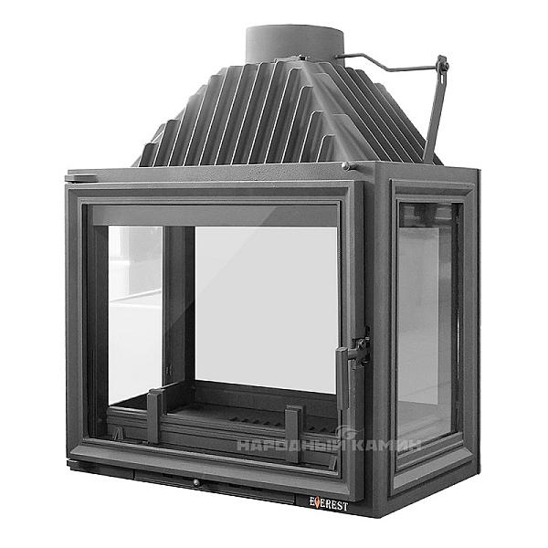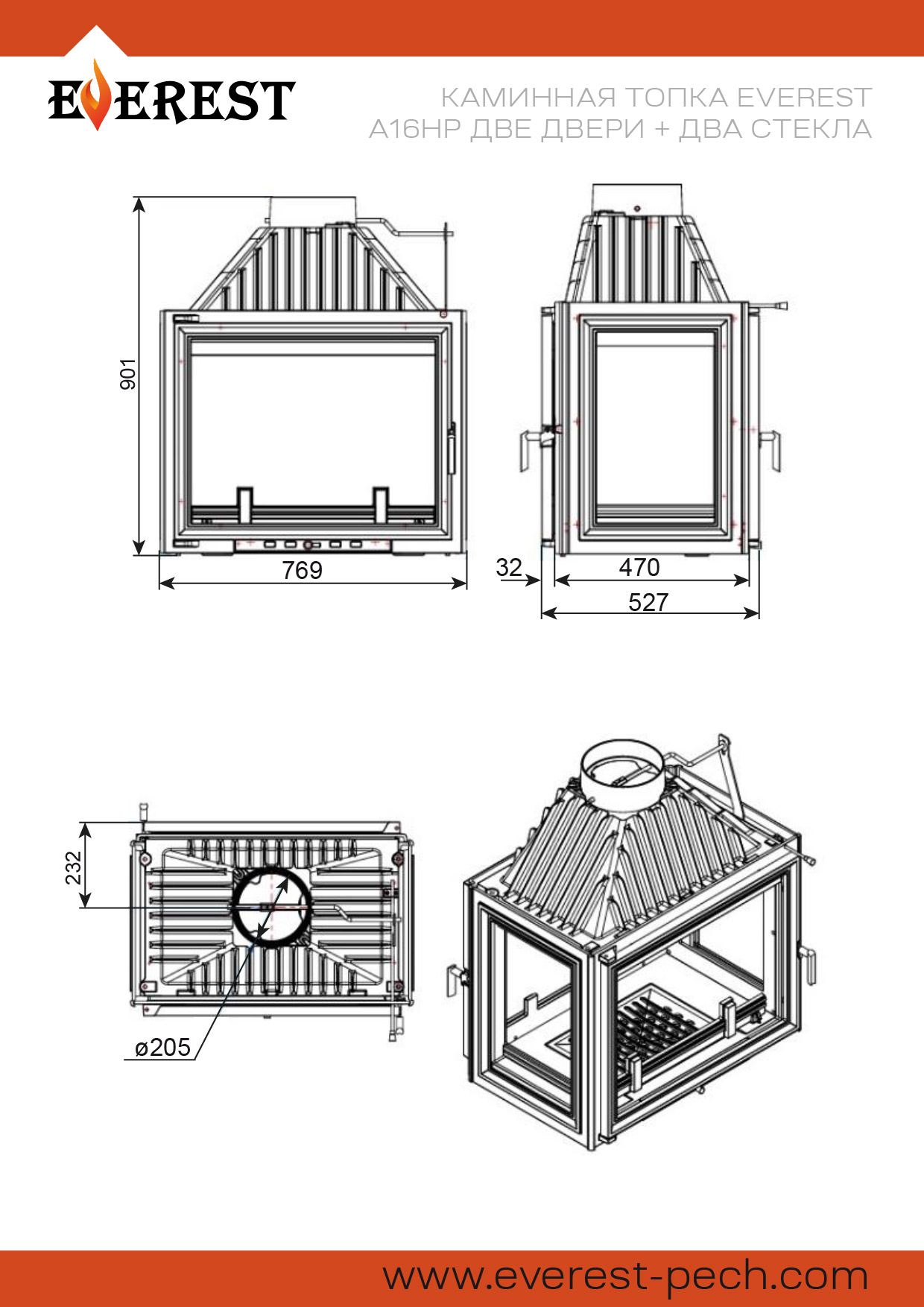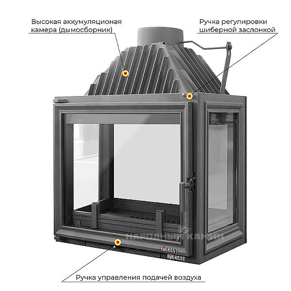 Смотреть всеКаминная топка EVEREST A16HP имеет топочную дверь установленную как с передней , так и с задней части, также данная модель имеет дополнительное остекление с левой и с правой стороны Топка изготовлена из качественного жаростойкого чугуна (ГОСТ 1412-85) с толщиной стенок 6-10 мм. Вес топки составляет 199кг. Модель рассчитана на обогрев помещений объёмом до 320 м³. Каминная топка имеет высокую Аккумуляционную камеру (дымосборник) и часто расположенные радиаторы на корпусе топки , которые обеспечивают высокий КПД и увеличивают мощность до 16 кВт. В Аккумуляционной камере (дымосборнике) установлен чугунный пламегаситель, Патрубок дымохода с внутренним диаметром 203 мм, оснащён поворотным шибером. Заслонка изготовлена из чугуна, а её положение регулируется ручкой на передней панели топки.