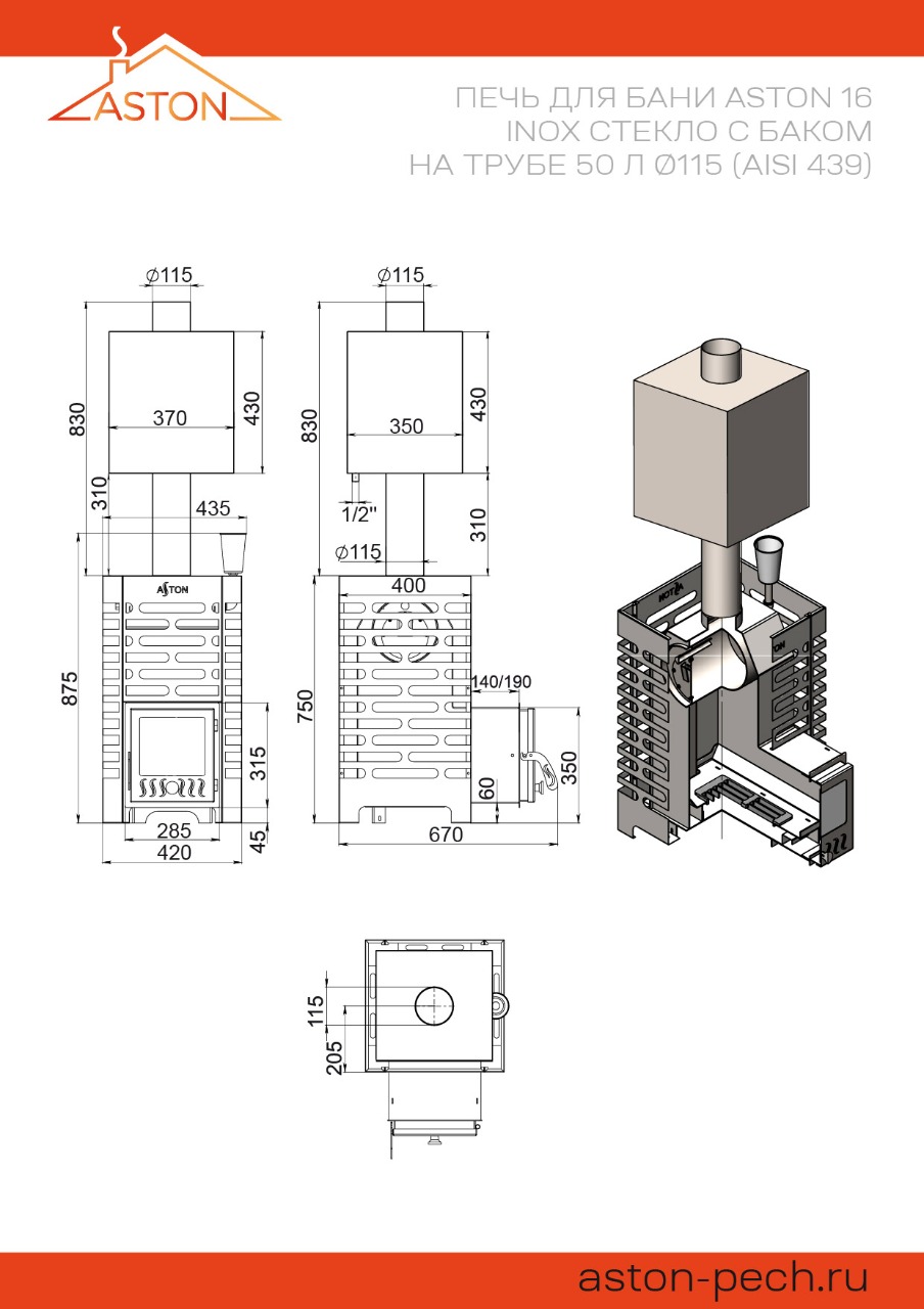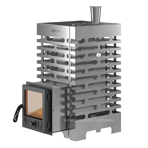 Печь для бани ASTON 16 INOX стекло с баком на трубе 50л Ø115 (AISI 439)