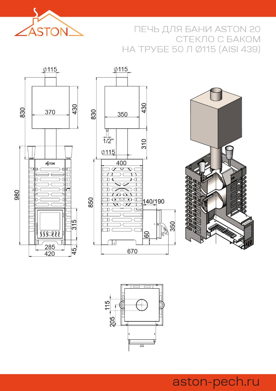 Печь для бани ASTON 20 стекло с баком на трубе 50л Ø115 (AISI 439)