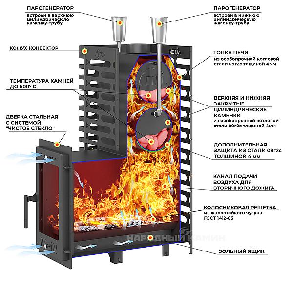 Сетка-каменка вмещает в себя 140-160 кг. камней. Также у АСТОН есть внутренняя закрытая каменка (+30 кг), подача воды в которую осуществляется через воронку, вынесенную наверх. Такая каменка позволяет получать легкий и мягкий пар.