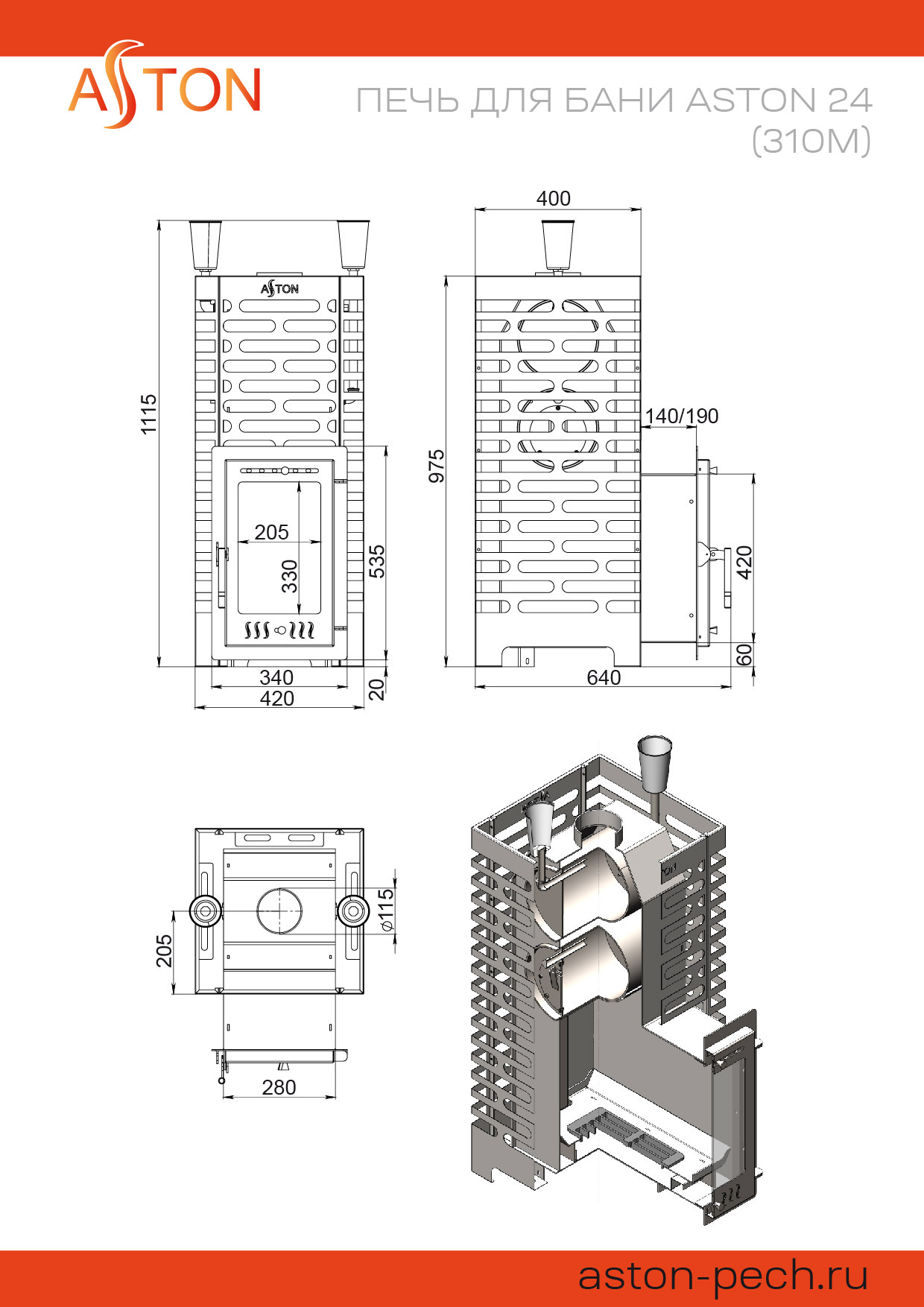 Смотреть всеПечь для бани ASTON 24 (310М) со стеклом подходит для парных объёмом от 22 до 26 м3.