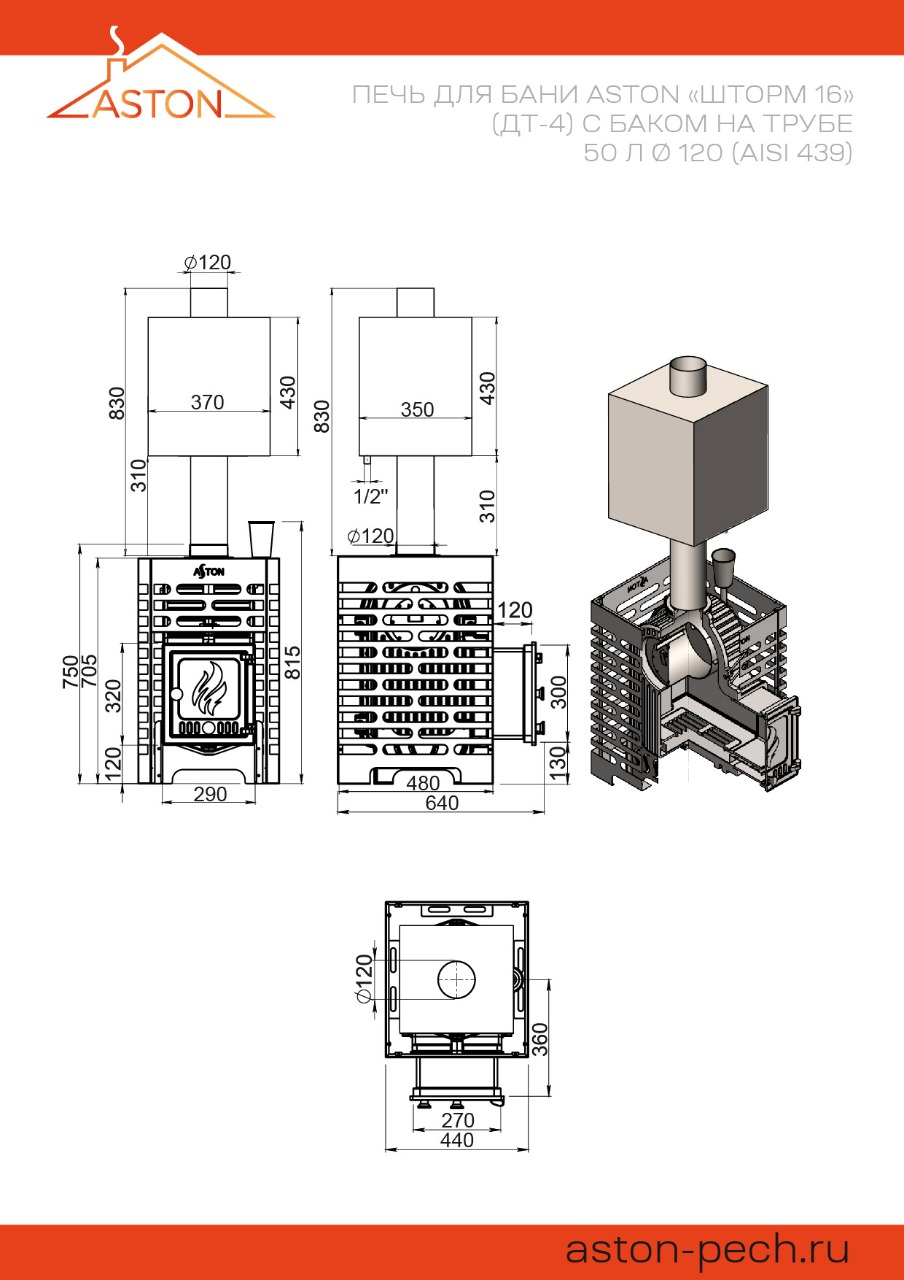 Схема банной печи ASTON «Шторм 16» (ДТ-4) с баком на трубе 50л Ø120 (AISI 439)
