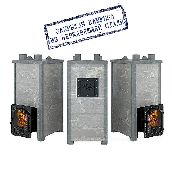 Закрытая каменка из Нержавеющей 4мм стали (AISI 430) сверху и снизу имеет закруглённую конструкцию. Каменка находится на месте пламегасителя. Огонь при горении дров охватывает каменку с четырёх сторон, что ускоряет нагрев заклада. Закрытая каменка рассчитана на размещение 60 килограммов камня для бани, создаёт массивный тепловой заряд. Каменка и внешний корпус изготовлены из чугуна, крепятся друг к другу по типу «паз-гребень» с использованием термостойкого герметика.