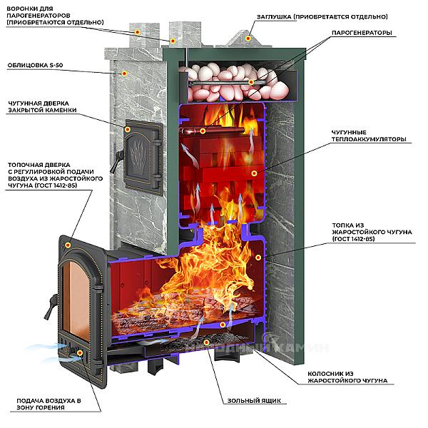 Каменка для установки заклада сверху и снизу имеет отверстия для прохода пламени и дымовых газов. Чугунные теплоаккумуляторы или камни находятся прямо в пламени. Каменка рассчитана на размещение 170-180 кг чугуна или 70-80 килограммов камня для бани, создаёт массивный тепловой заряд. Внешний корпус изготовлен из чугуна, его части крепятся друг к другу по типу