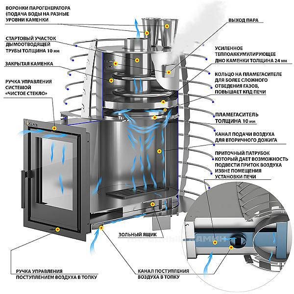Стартовый участок дымоотводящей трубы толщиной 10 мм и диаметром 115 мм предназначен для максимального теплосъёма, он увеличивает площадь нагрева заклада внутри каменки, что быстрее выводит печь в рабочий режим. Дно закрытой каменки толщиной 24 мм не только разделяет пространство топочной камеры и самой каменки, но и является мощнейшим теплоаккумулятором который накапливает в себе энергию и отдает ее в заклад каменки. На пламегасителе толщиной 10 мм предусмотрено кольцо, оно предназначено для более сложного отвода дымовых газов, в следствии чего увеличивается кпд изделия.