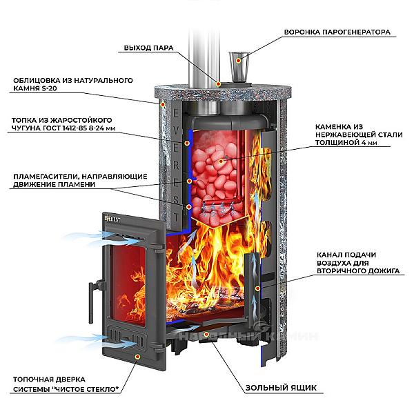 Топочная камера печи – сборная, состоит из трёх деталей, соединяемых между собой на болтах. Вертикальные швы по краю деталей соединяются по принципу паз-гребень, что обеспечивает высокую герметичность топки и минимальную деформацию даже при длительном нагреве. Соединение не требует применения уплотнителей шва, достаточно только герметика. Верхняя часть топки изготовлена из чугунных колец. В печи Эверест "Steam Master" 30 ЧУГУН Ламель Талькохлорит, S-20 между топкой и крышкой размещено два кольца высотой 120 мм. Для полного сгорания топлива в топке устроены каналы вторичного дожига, подающие воздух из поддувала в верхние точки камеры, в места скопления разогретых газов.