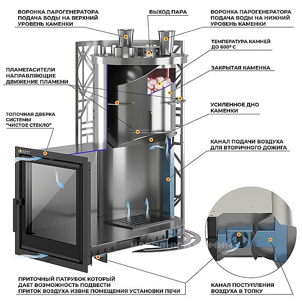 Закрытая каменка печи сделана также из нержавейки (4 мм) и имеет форму цилиндра. Она окутывается огнем со всех сторон, благодаря чему камни нагреваются свыше 550℃. Вода в каменку подается через воронку сверху печи. Далее по трубке она попадает на самые горячие камни, обеспечивая много легкого и мягкого пара.