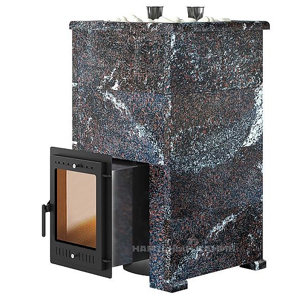Облицовка печи выполнена из натурального камня толщиной 40 мм, которая аккумулирует тепло и преображает интерьер банного пространства.
