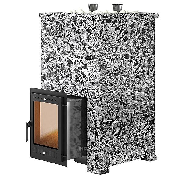 Облицовка печи выполнена из натурального камня толщиной 40 мм, которая аккумулирует тепло и преображает интерьер банного пространства.