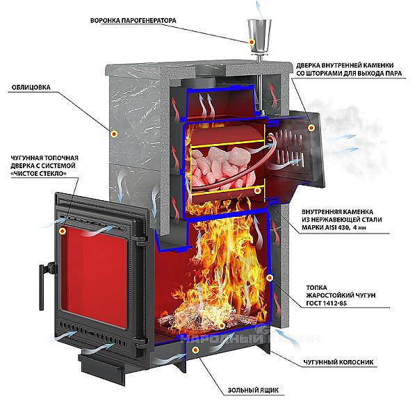 Данную модель печи отличает от аналогов то, что закрытая каменка расположена внутри топки. Это позволяет максимально быстро и хорошо прогревать камни, которые расположены внутри каменки. На камни через специальную трубку с отверстиями поддается вода, которая моментально испаряется, превращаясь в мелкодисперсный пар.