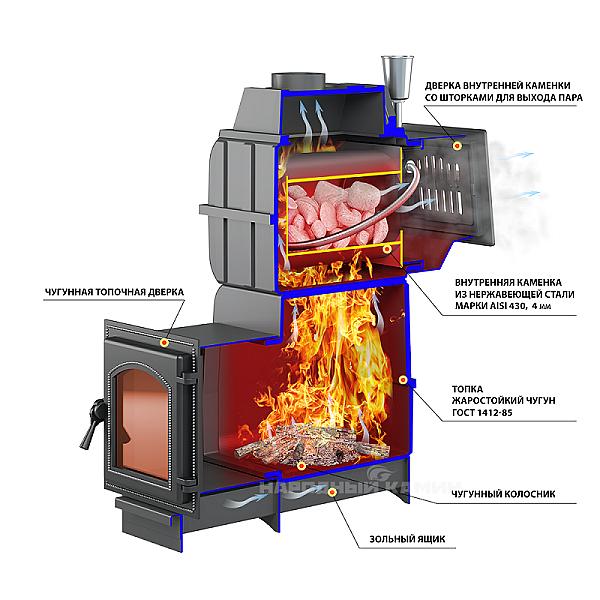 Печи «Легенда Русский пар 18» отличаются наличием закрытой каменки, в которой камни прогреваются до температуры 600°С, что позволяет создать в парилке наиболее благоприятный микроклимат, не пересушивая и не перегревая воздух. Вода подается в центральную самую горячую часть закрытой каменки через воронку, дверь закрытой каменки при этом должна быть приоткрыта для поступления мелкодисперсного пара в парное отделение. Все элементы топки отлиты из жаропрочного чугуна и соединены между собой с помощью болтового соединения через термостойкий шнур и герметик, а закрытая каменка изготовлена из жаростойкой высоколегированной 4 мм нержавеющей стали.