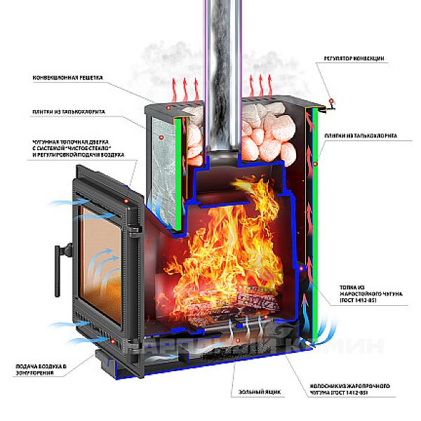 Топочная дверь с большим стеклом предаёт удобство в контроле прогорания дров. Благодаря выносному топливному каналу печь можно топить из предбанника, комнаты отдыха.
