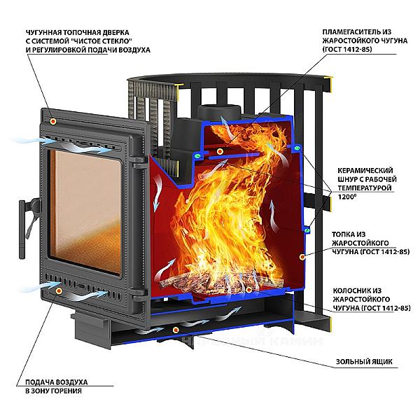 Надёжна и долговечна так как топка изготовлена из чугуна и состоит из трёх элементов. Между элементами, при помощи термостойкого герметика, прокладывается термостойкий керамический шнур. Элементы топки соединены между собой болтовым соединением, что даёт 100% гарантию безопасности при эксплуатации. Срок службы, заявленный производителем, до 30 лет.