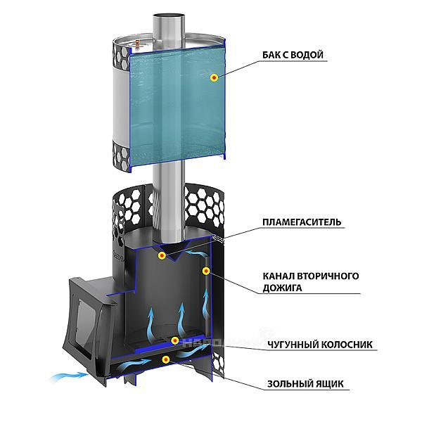 Особенностью модели является наличие бака для воды объемом в 50 литров, выполненном в едином стиле с печью