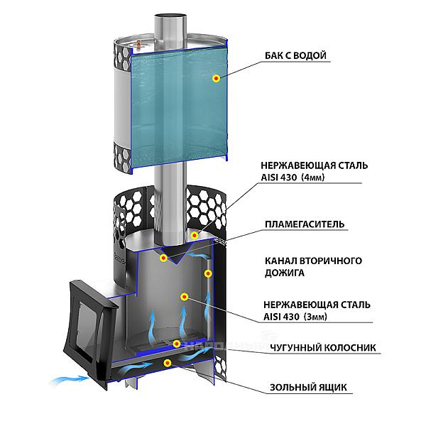 Особенностью модели является наличие бака для воды объемом в 50 литров, выполненном в едином стиле с печью
