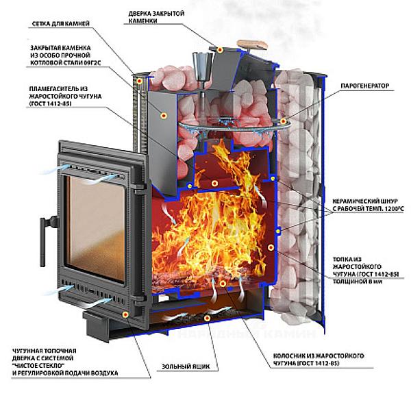 Через каминную дверцу можно наблюдать за горением дров. Выносной топливный канал позволяет топить печь из предбанника, мойки или комнаты отдыха.