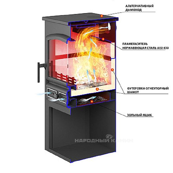 Интенсивность горения регулируется рычажком на поддувальной дверке. Максимальная длительность горения на одной закладке дров составляет до 5 часов.