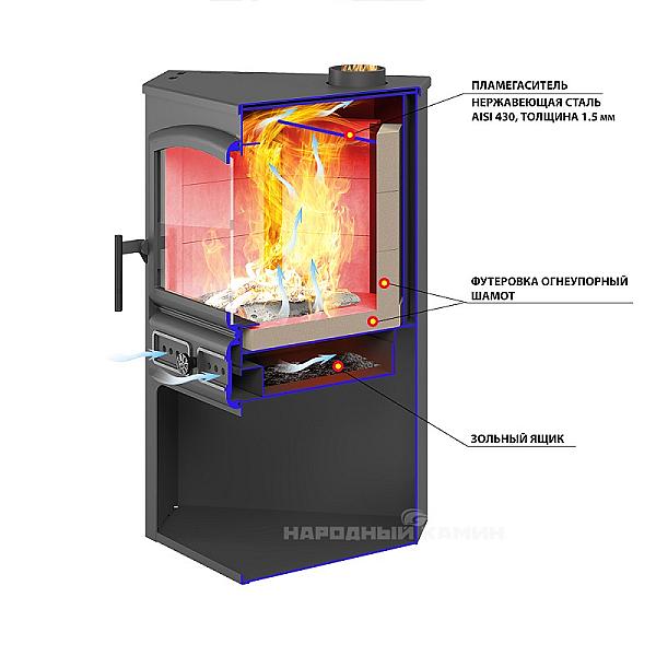 Интенсивность горения регулируется рычажком на поддувальной дверке. Максимальная длительность горения на одной закладке дров составляет до 5 часов.