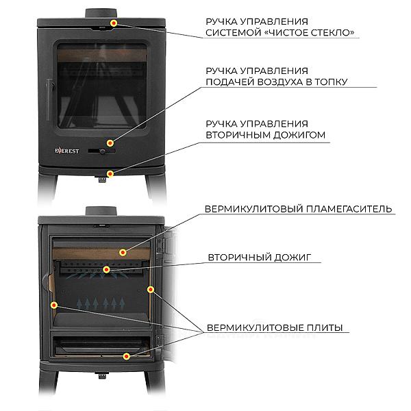 Топочная дверца укомплектована термостойким стеклом. Под ней находятся регулировки подачи воздуха в топку и на вторичный дожиг.
