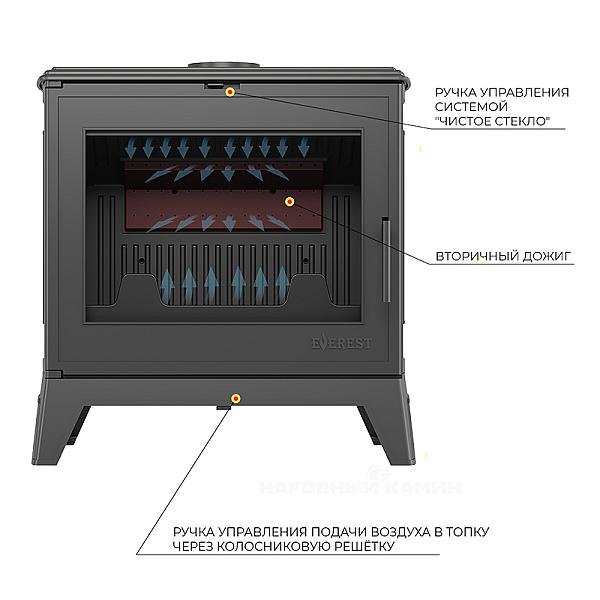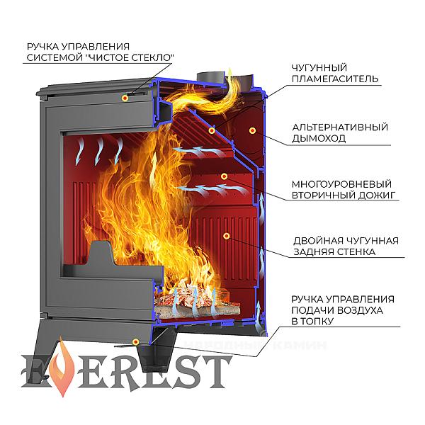 Печь-камин имеет пламегаситель изготовлен из жаростойкого чугуна (ГОСТ 1412-85). Топка печи-камина усилена чугунными вставками с системой трёхуровневый вторичного дожига. С помощью этой функции по каналам подачи вторичного воздуха поступает воздух, который нагревается при прохождении между топочной камерой и стенками корпуса. Далее нагретый воздух через дефлектор поступает в топку, перемешивается с газами - продуктами горения, чем вызывает повторное возгорание.