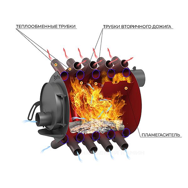 АОГТ представляет собой печь длительного горения. Вваренные в корпус многочисленные трубы обеспечивают принудительную конвекцию, благодаря чему происходит быстрый нагрев воздуха в помещении.