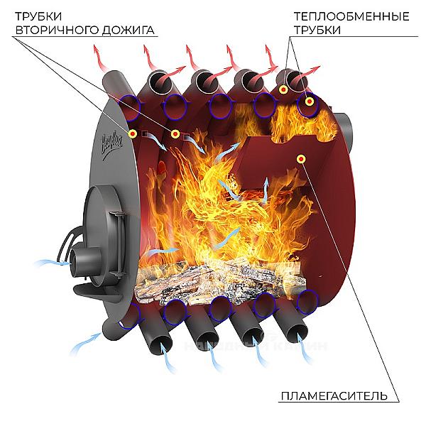 Две камеры сгорания, нижняя камера газификации и верхняя камера дожига газов, обеспечивают практически полное сгорание топлива и получение максимального количества энергии во время работы печи.