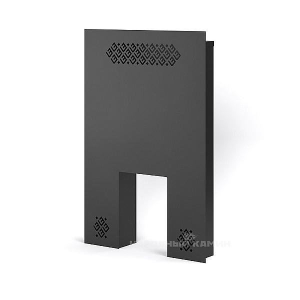 Фронтальный защитный экран сделан в виде П-образной арки, которая обрамляет топочную дверку и топочный тоннель печи. Передняя панель экрана имеет толщину 2 миллиметра, остальные элементы – толщиной 1 миллиметр. Небольшой борт по периметру передней панели позволяет красиво отделать экран и скрыть швы между экраном и стеной.