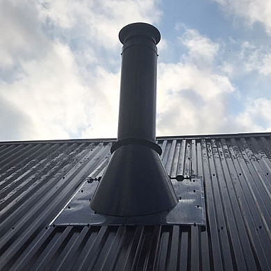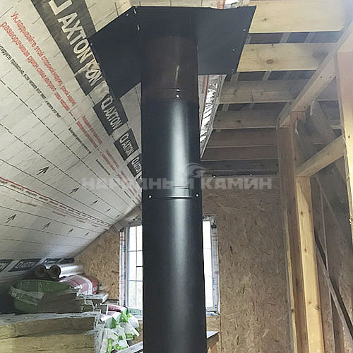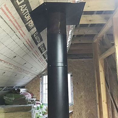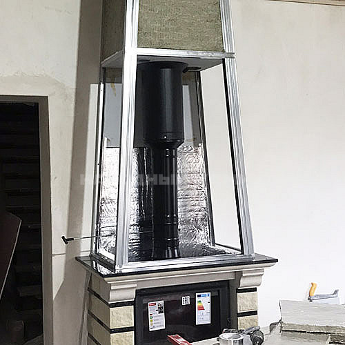 В качестве дымохода выбрана система сэндвич-труба MAGMA с внутренней сталью AISI 439 толщиной 0,8 мм. и слоем изоляции в 50 мм. При температуре внутри трубы 500-550°С наружный контур нагревается не выше 95°С.