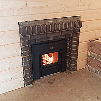 Печь установили на основание из кирпичей. Данная модель топится из смежного помещения. Портал для выносного топливного канала изготовлен из кирпича LODE M-500 коричневого цвета.