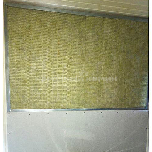 Основание под печь изготовлено из агломератных плит, уложенных на фиброцементную плиту ЛТМ Фламма и базальтовый картон. Термоизоляционная стена в парной сделана из металлопрофиля и изоляционных плит Rockwool Firebatts, которые снаружи "зашиты" плитами «Минерит ЛВ» сауна. Возможна дальнейшая чистовая отделка стен разными материалами.