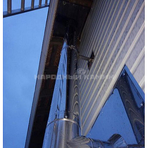 Модульный нержавеющий дымоход LAVA ELIT проходит через стену и поднимается по фасаду бани. На улице он закреплен на опорном и телескопическом кронштейнах. При проходе через скат кровли использована гидроизоляционная проходка Master-Flash.